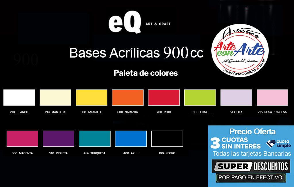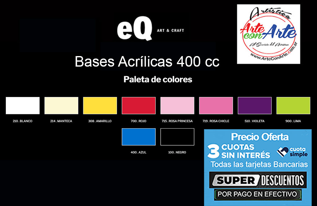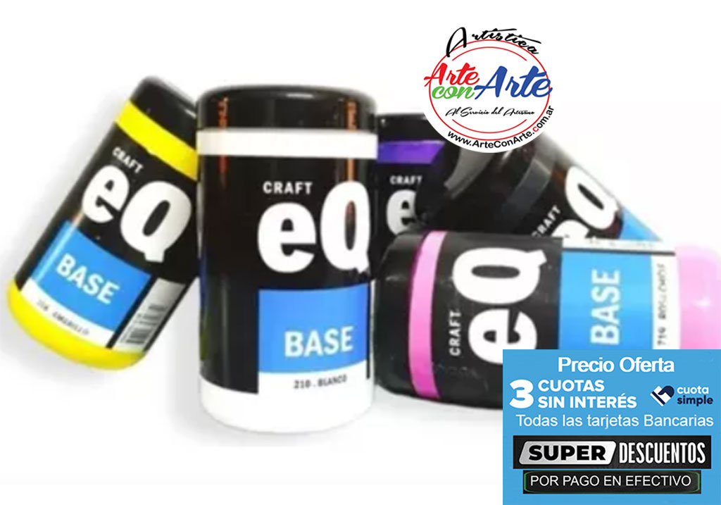 Las Bases Acrílicas EQ Arte son ideales para fondear superficies porosas (maderas, yeso, etc.), actuando como selladora y dejando una base pareja y coloreada. Una vez secas pueden pintarse con todo tipo de pinturas. Pueden aplicarse con pinceles o rodillo y son soluble en agua.